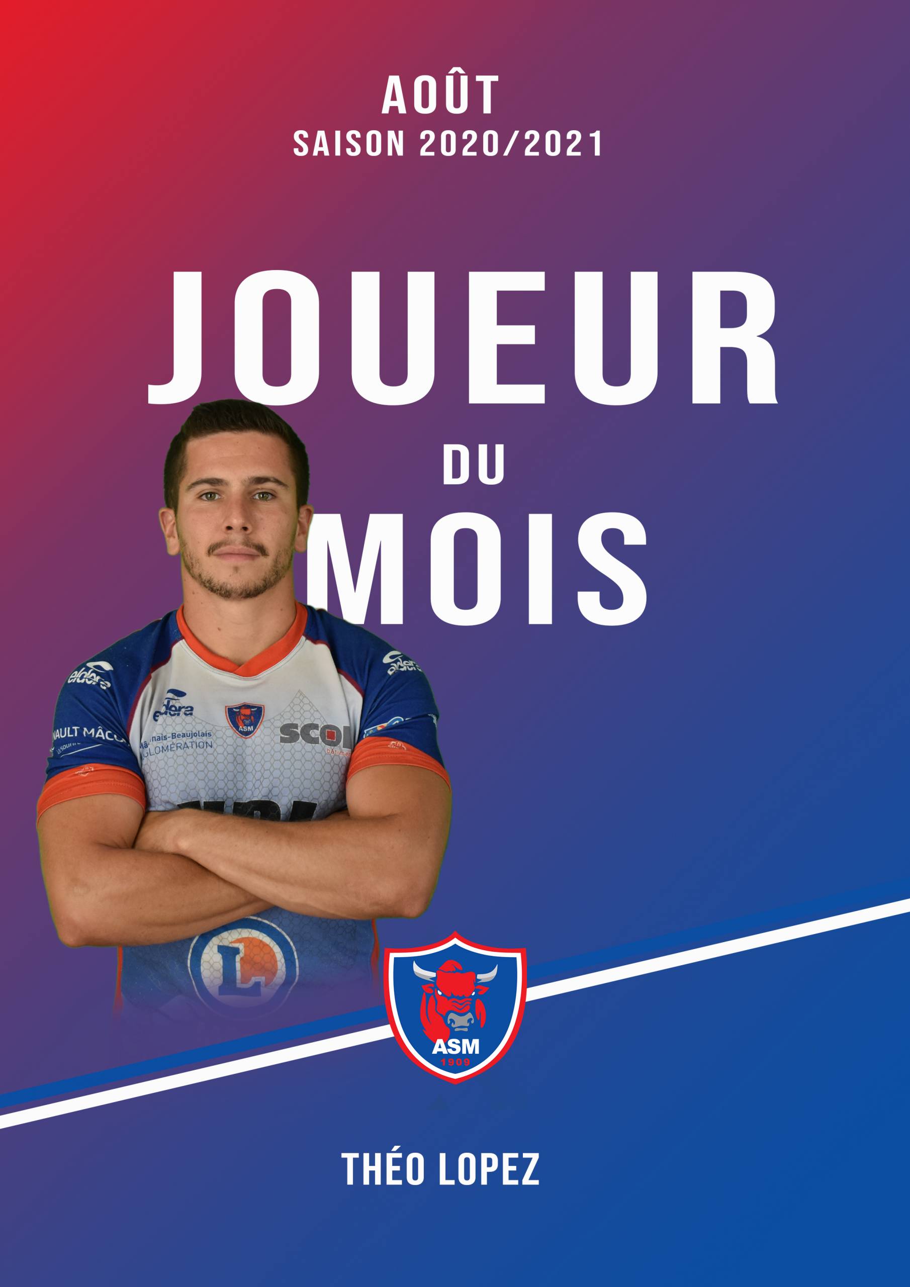 Pour sa troisième saison sous les couleurs de l’ASM, Théo Lopez s’annonce déjà comme un homme fort de l’effectif mâconnais pour la saison 2020/2021 de Fédérale 1. Le jeune ailier de 25 ans a été élu joueur du mois d’août par l’ensemble du staff de l’équipe première. Guillaume Aguilar, manager générale sportif, s’est exprimé à son sujet : “Théo est un joueur sérieux, qui s’entraine sans cesse dans l’optique de donner le meilleur. Il s’impose des séances supplémentaires à chaque entraînement et aujourd’hui son travail est récompensé. C’est un joueur facile à entrainer et un homme respectueux de tout et de tous, et c’est très important dans la vie de groupe !”